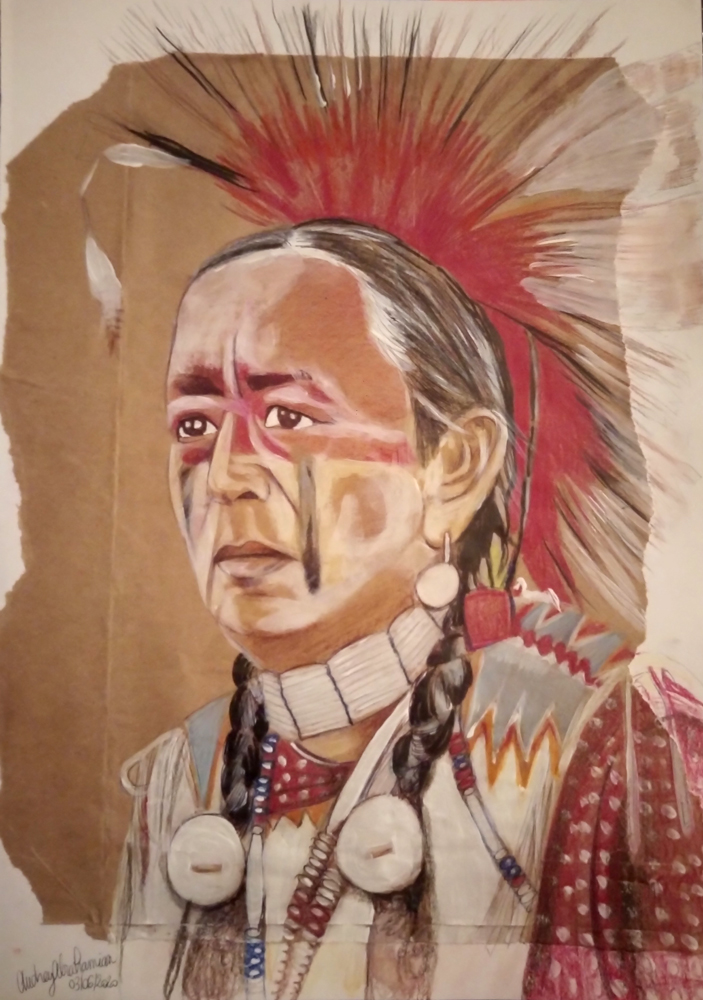 Acrylique et crayon sur kraft et feuille papier, 21×29,7cm. Amérique indien (2020), d’après une photo de fotosearch__djb1823. Dessin par Audrey Laure Abrahamian LAA.