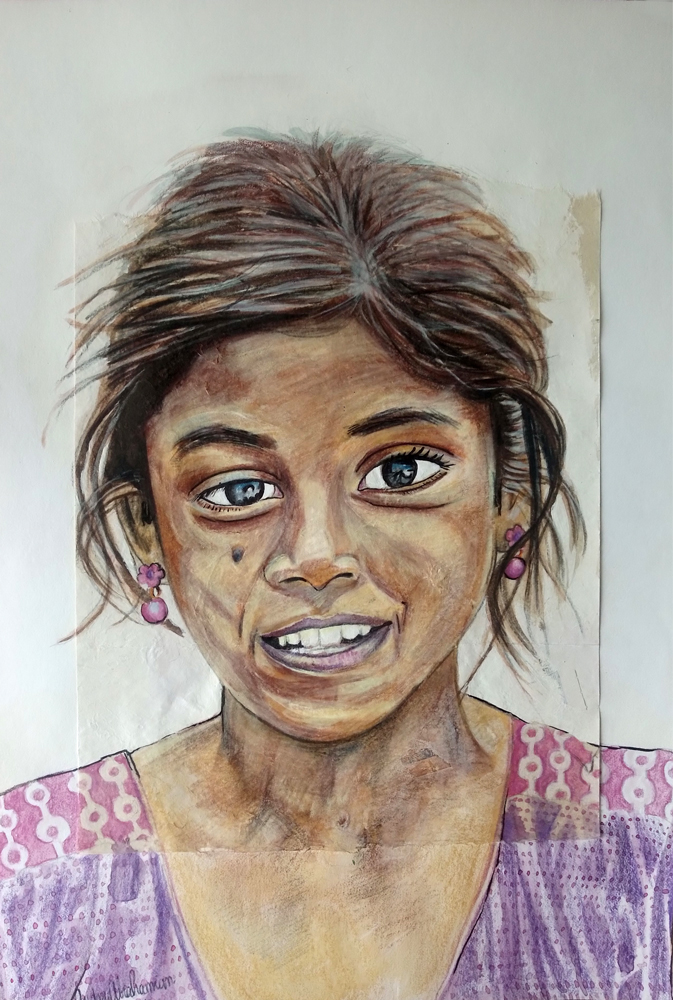 Acrylique et crayon sur kraft et feuille papier, 21×29,7cm. Inde Fillette (2020) d’après une photo de Thierry Jacquet juillet 2014. Dessin par Audrey Laure Abrahamian LAA.