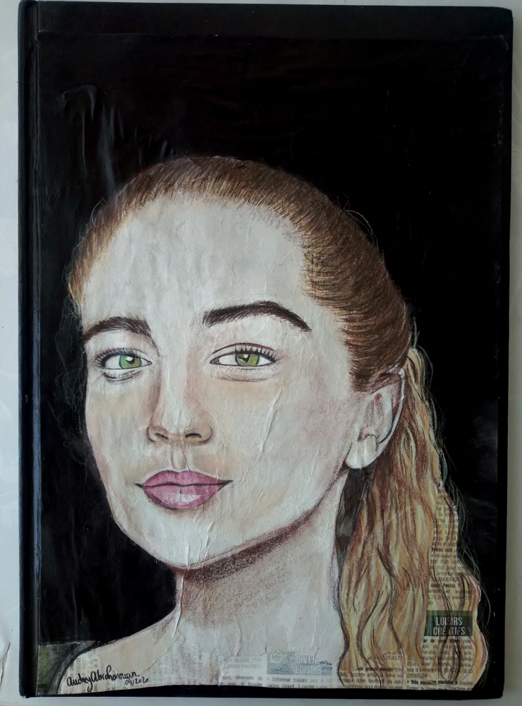 Acrylique et crayon sur kraft et feuille papier, 21×29,7cm. Juliette (2020). Dessin par Audrey Laure Abrahamian LAA.