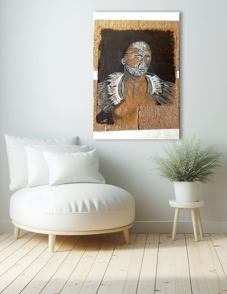 Technique mixte : Acrylique et crayon sur support craft, carton sur toile, 70x120cm . Maori Nouvelle-Zélande (2021) d’après une photo de Jimmy Nelson. Dessin par Audrey Laure Abrahamian LAA.