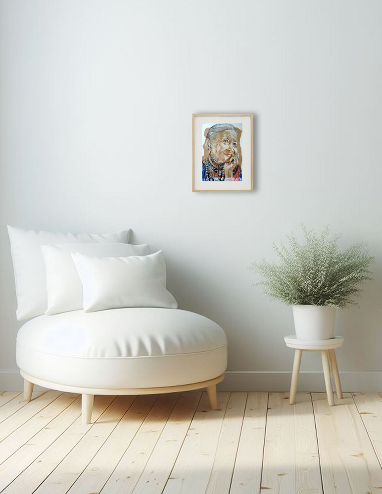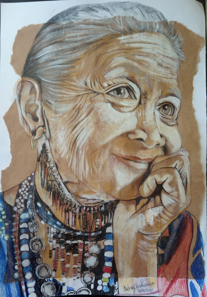 Acrylique et crayon sur craft et feuille papier, 21,5×27 cm. Philippines femme de la tribu Bagobo (2020), d’après une photo de Jojie Alcantara 2008. Dessin par Audrey Laure Abrahamian LAA.